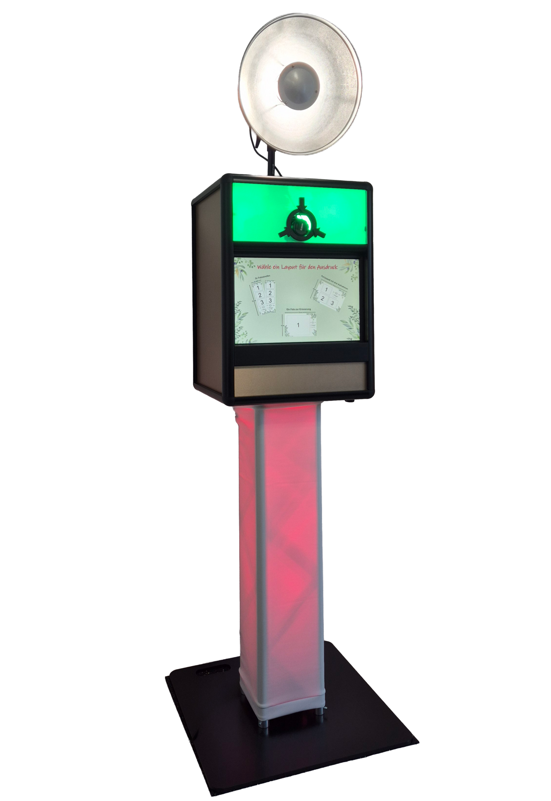 Die Kombination aus der Traverse mit RGB-Lichtsäule und dem Beauty-Dish mit einer warmweißen Grundbeleuchtung sorgt dafür, dass unsere Fotobox zu jeder Location passt.